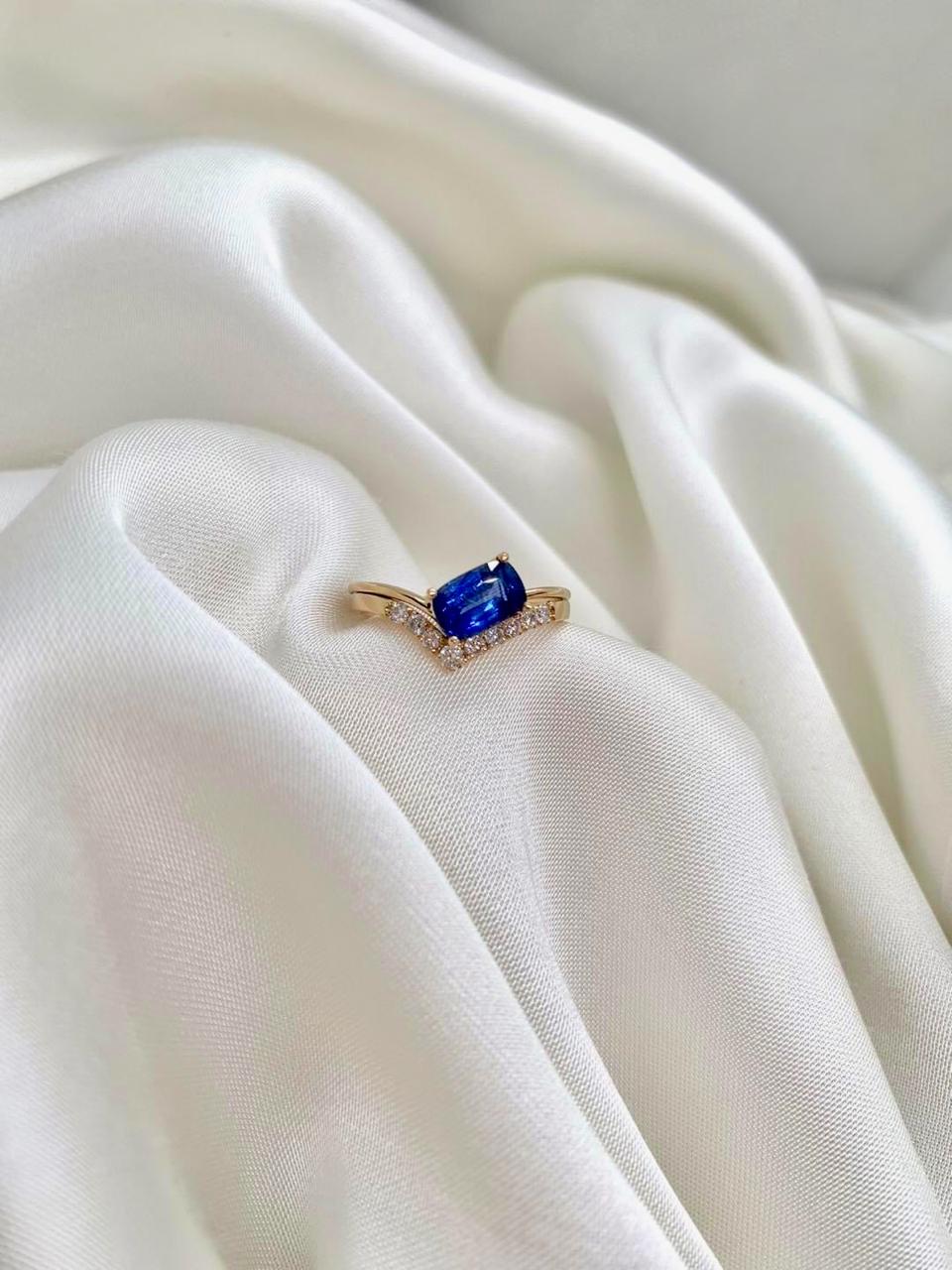 Élégance intemporelle et noblesse des pierres : cette bague en or 18 carats (2,40 g) magnifie un saphir bleu royal de 1,15 ct, rehaussé d’éclatants diamants. Une création précieuse, symbole de raffinement absolu.