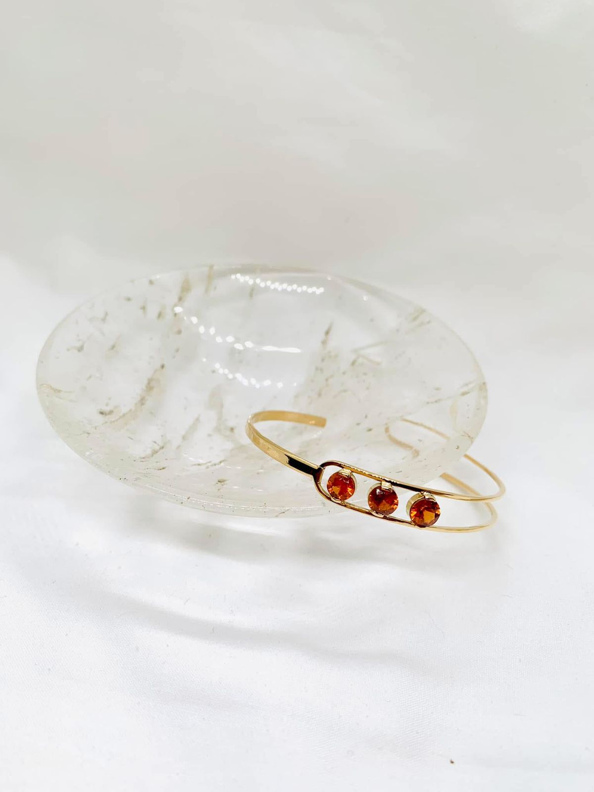 Bracelet ‘Trinité Stellaire’ en or 18 carats (6 g), serti de trois grenats spessartites aux reflets ardents, soigneusement sélectionnés dans la région d’Antanimbary, à l’ouest de Madagascar. Chaque pierre incarne une étoile flamboyante, alignée avec grâce sur une monture épurée. Une pièce unique, à la fois précieuse et poétique, inspirée des constellations célestes.